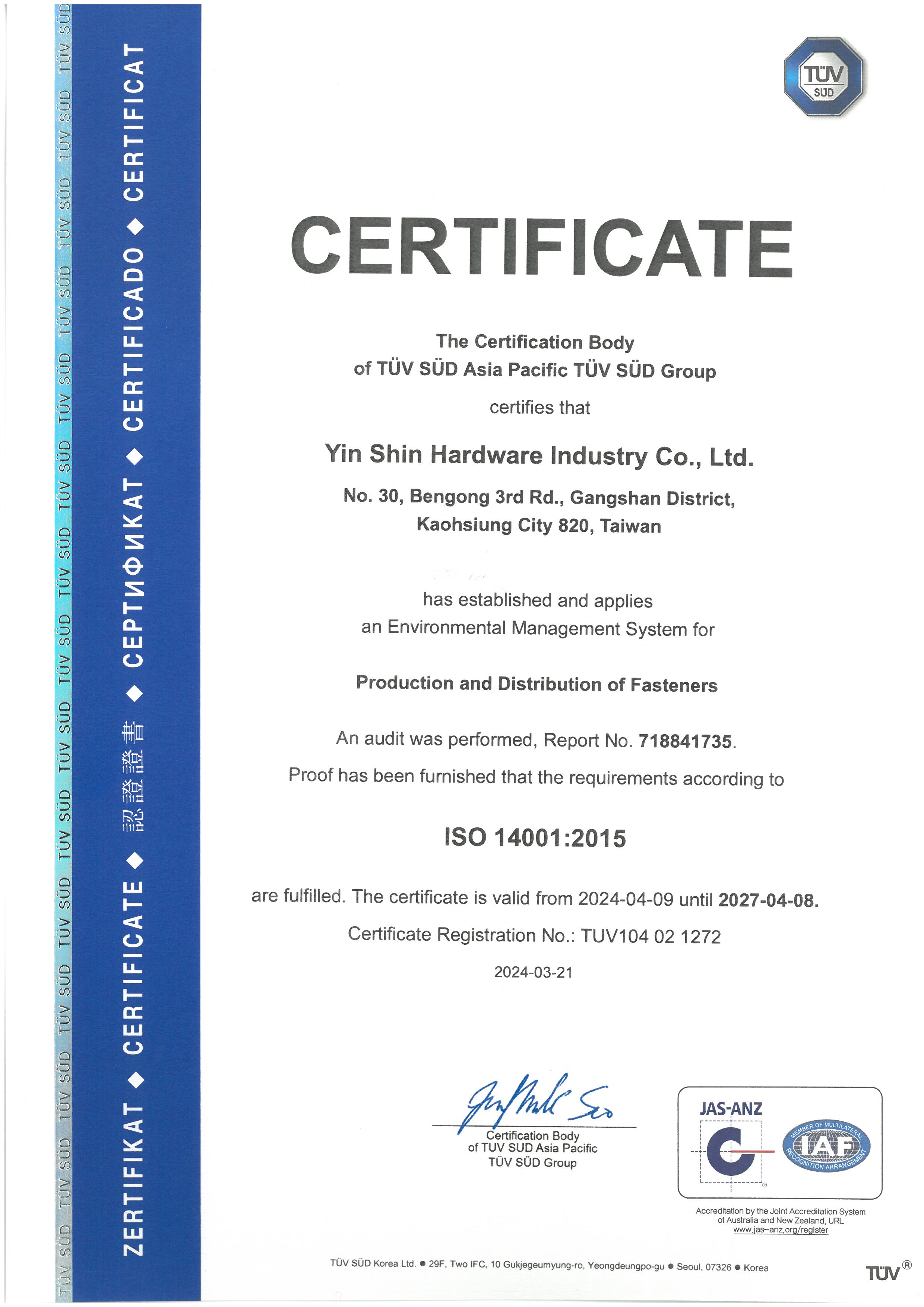 更新 環境證書 ISO 14001:2015 (TUV SUD),有效至 2027.04.08 。